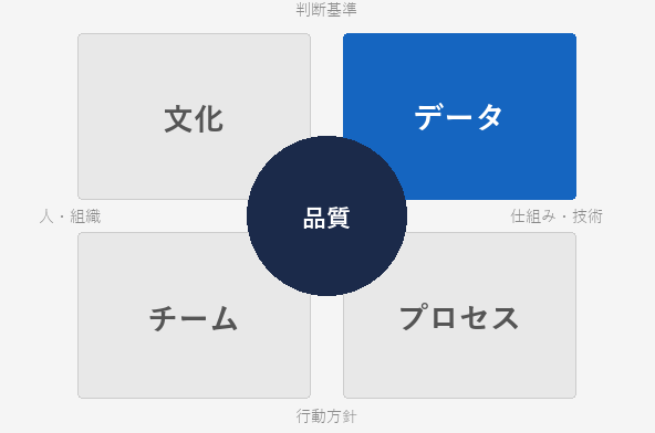 データとは、技術・仕組みと判断の関係から品質を捉える構造です。 品質に関する判断を、 兆候や事実に基づいて行えるかどうかが焦点になります。
