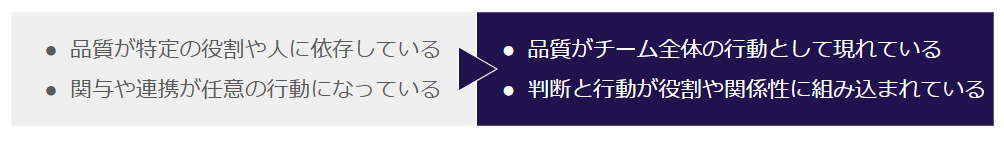 チームとして品質を捉えるとは、 判断が誰かの善意や頑張りに依存せず、 役割や関係性の中で、行動として自然に現れる構造 を整えることです。