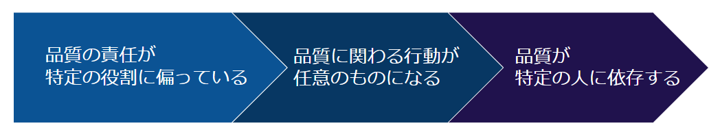 品質に対する責任が暗黙のうちにPMやQAといった特定の役割に集約されていると、それ以外のメンバーは品質を「関与する対象」ではなく「任せる対象」として捉えるようになります。品質が自分ごとになるのは担当として割り当てられたときだけになり、チーム全体としての関与は生まれにくくなります。