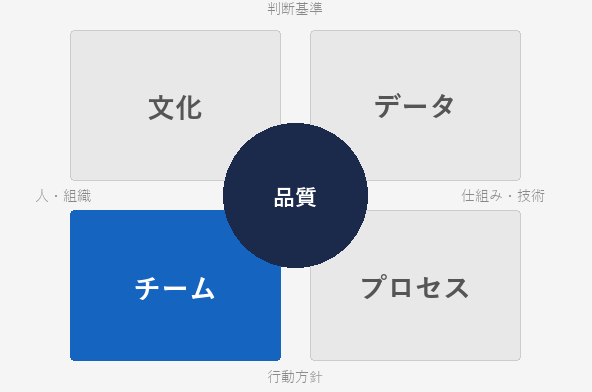 同じプロセスでも、チームが違えば品質の結果は大きく変わります。チームとは、品質をつくるために、人や役割、関係性がどのように機能しているかを指します。連携や関与が自然に生まれるチームでは品質は安定しますが、役割や関係性が分断されていると、品質は特定の人や場面に左右されるようになります。